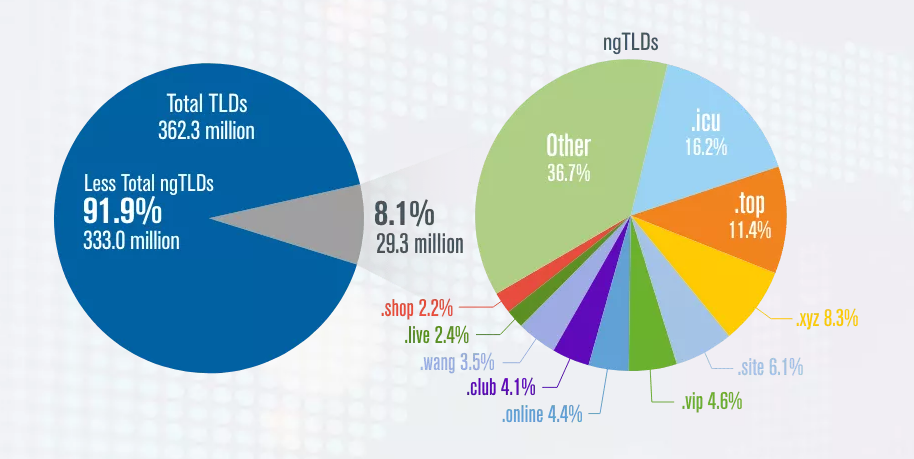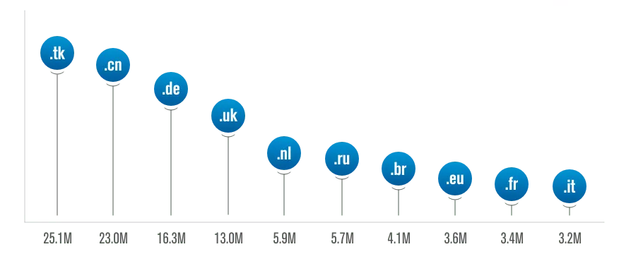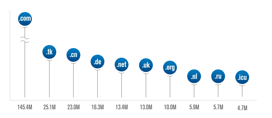 报告中表明,域名数量*多的*域名依次为.com,.tk,.cn,.de,.net,.uk,.org,.nl,.ru和.icu。